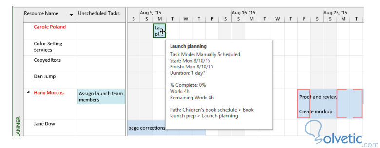 Para corregir este problema potencial también contamos con la vista de planificación de equipo, en ella podemos ver las diferentes tareas y recursos de una manera más sencilla, lo que nos da el rango visual de poder ajustar las cosas sin preocuparnos tanto por los detalles.