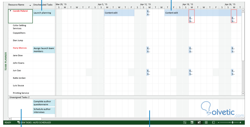 Entonces podemos decir que la vista de planificación de equipo nos da una interfaz en la cual podemos organizar y reorganizar las tareas y asignaciones simplemente arrastrando las tareas en la pantalla.