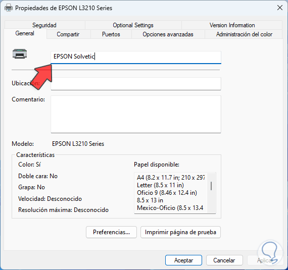Aplica los cambios y el nuevo nombre será aplicado a la impresora: