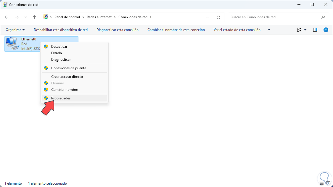 Damos clic en "Ver conexiones de red", luego damos clic derecho sobre el adaptador de red y seleccionamos "Propiedades":