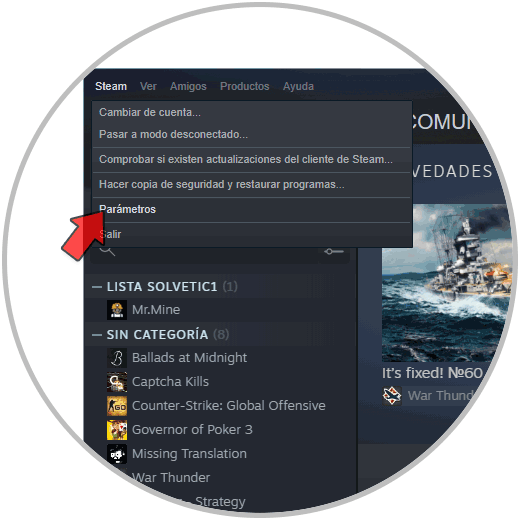 Para activar o validar este aspecto, abrimos Steam y vamos a "Steam - Parámetros":