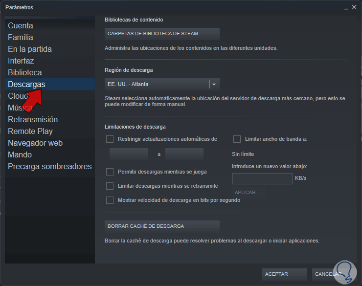 Luego en Descargas cambiamos la región actual en "Región de descarga":