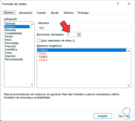 En "Número" en "Posiciones decimales" definimos cuantas posiciones usar: