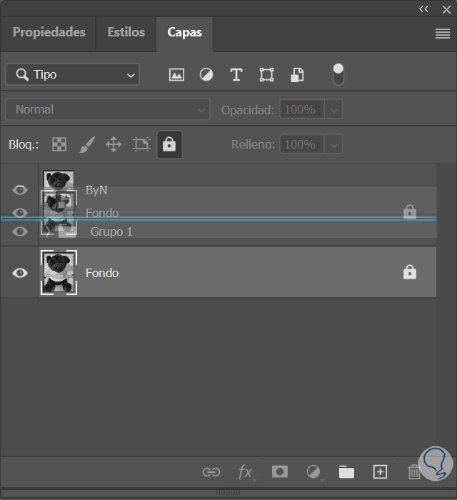 Por defecto la capa inicial más inferior o capa Fondo vendrá siempre bloqueada por lo que no se podrá modificar su orden, modo de fusión u opacidad si no la transformamos antes a capa Fondo.