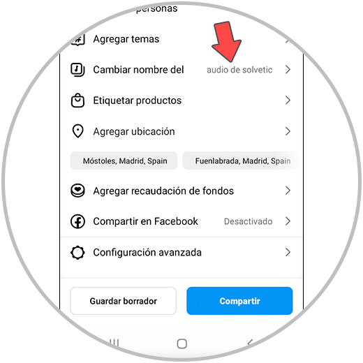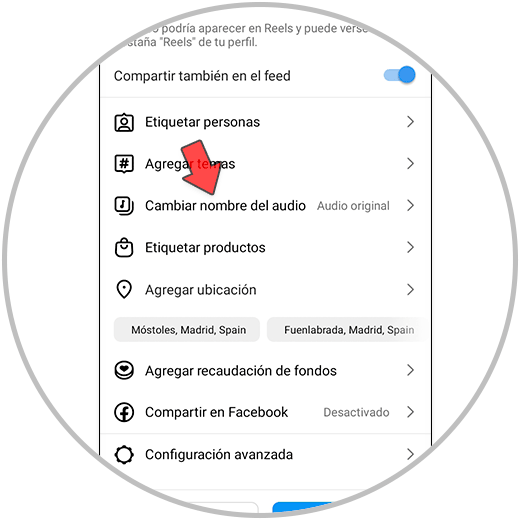 Lo primero que tienes que hacer es crear tu propio Reel con un audio original (es decir, sin añadirle música o audios de la biblioteca de Instagram). Una vez hecho en la última pantalla vas a encontrar estas opciones, y aquí tienes que pulsar en “Cambiar nombre del audio”.