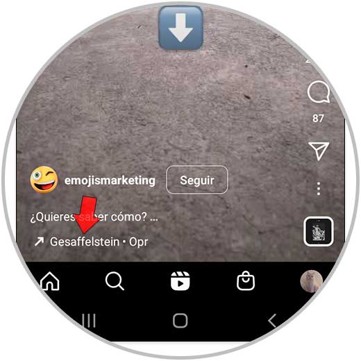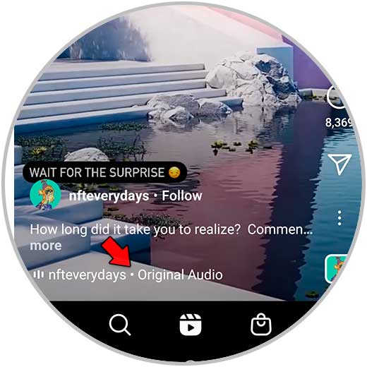 Desliza hacia arriba la pantalla para ir viendo los diferentes Reels hasta llegar al Reel del que quieras guardar el audio. En el Reel, en la esquina inferior izquierda, aparecerá el nombre del audio o de la música. Pulsa sobre ésta.