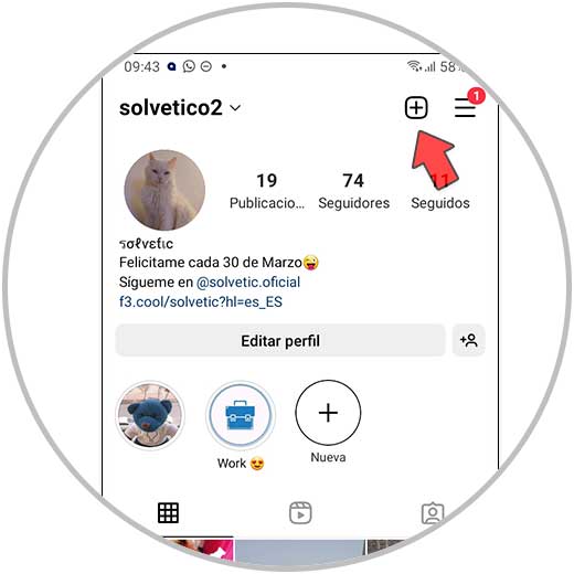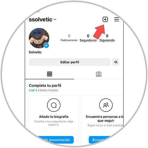 Lo primero que haremos será pulsar en el icono “+” en la esquina superior derecha desde tu perfil.