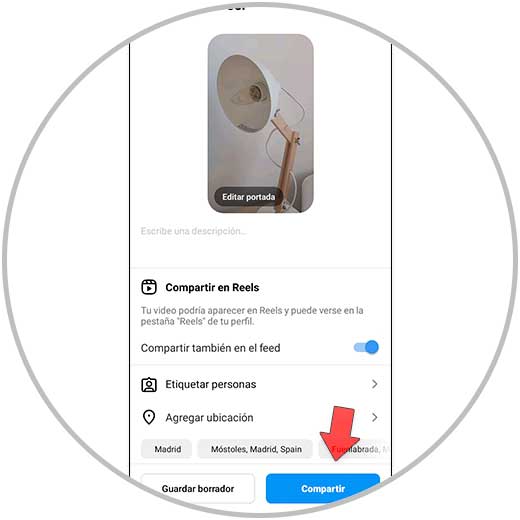 En esta pantalla podrás editar la portada, etiquetar personas, añadir un pie de foto…Cuando hayas terminado pulsa “Compartir” para publicar tu Reels.