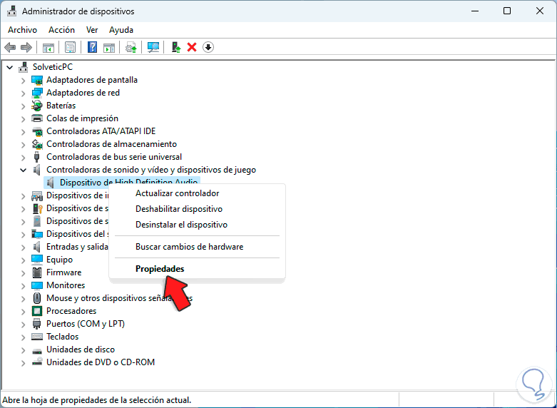 En "Controladoras de sonido y video y dispositivos de juego" damos clic derecho sobre el controlador y seleccionamos "Propiedades":