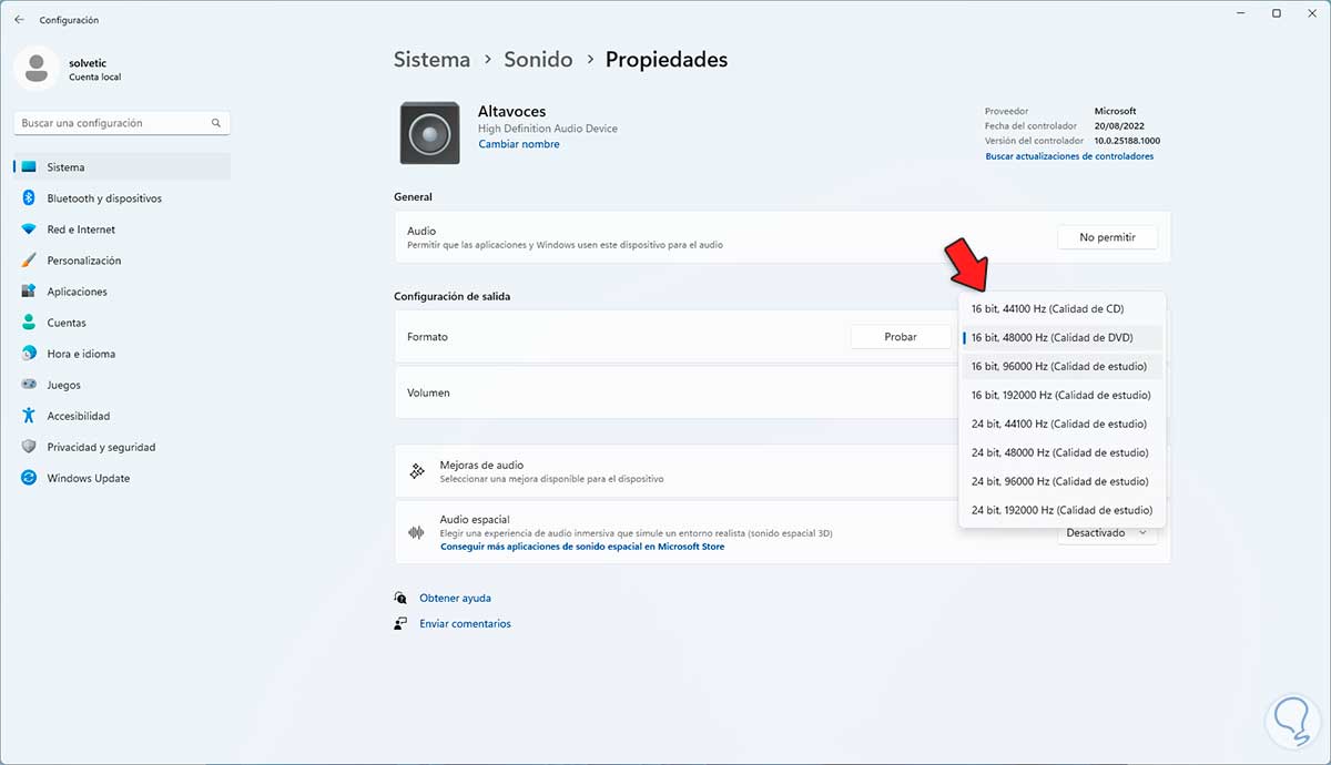 11. Salida de Audio Windows 11 No Funciona | Solución usando un formato de audio diferente