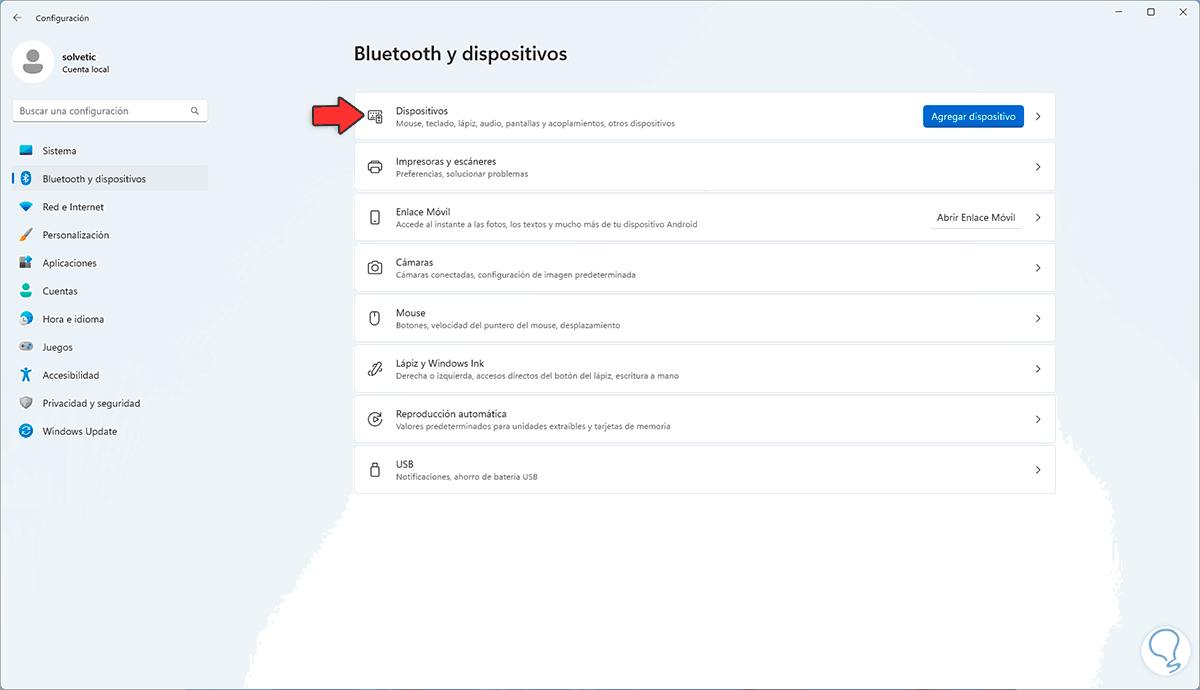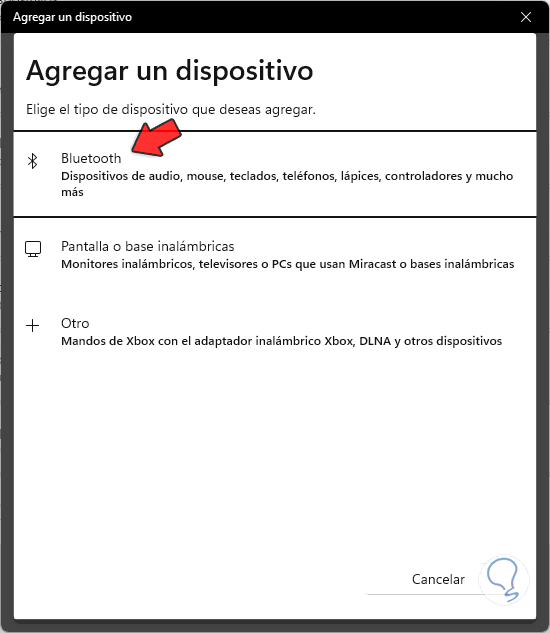Selecciona "Bluetooth" en caso de hacer uso de un dispositivo de este tipo y sigue los pasos del asistente para agregarlo.