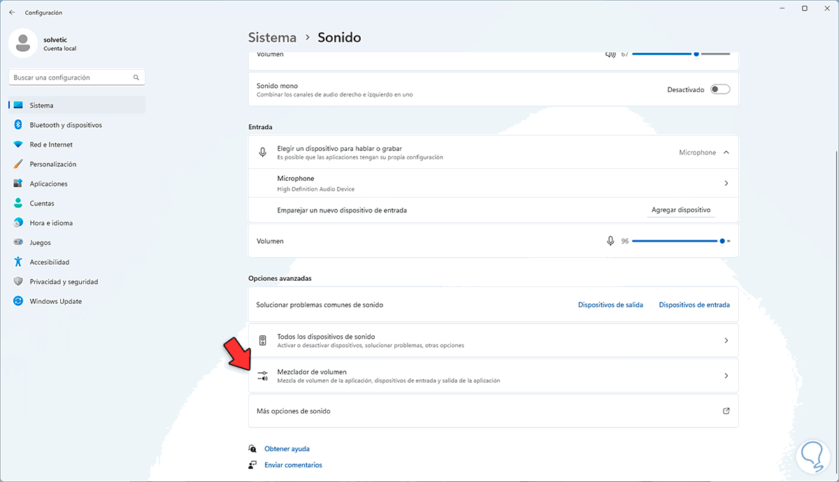 Ahora damos clic en "Mezclador de volumen" en Configuración: