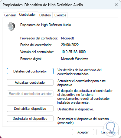Algunas actualizaciones del controlador de audio pueden generar el efecto contrario en el controlador y en lugar de mejorarlo ocasionan errores, es posible volver al controlador anterior si este es el caso.