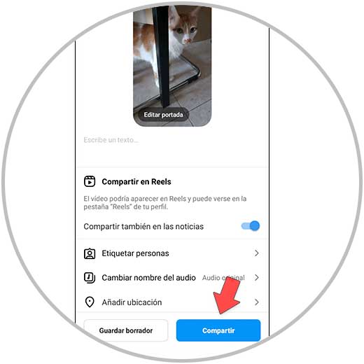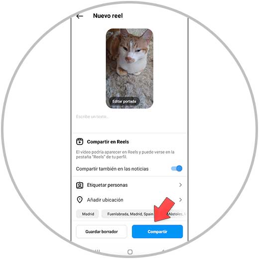 En la última pantalla, puedes seleccionar los últimos detalles como cambiar la portada, etiquetar personas, etc… Para publicar tu Reel de fotos, pulsa “Compartir”.