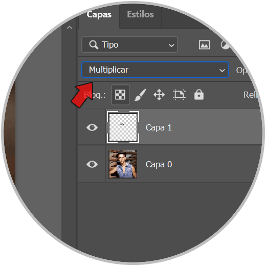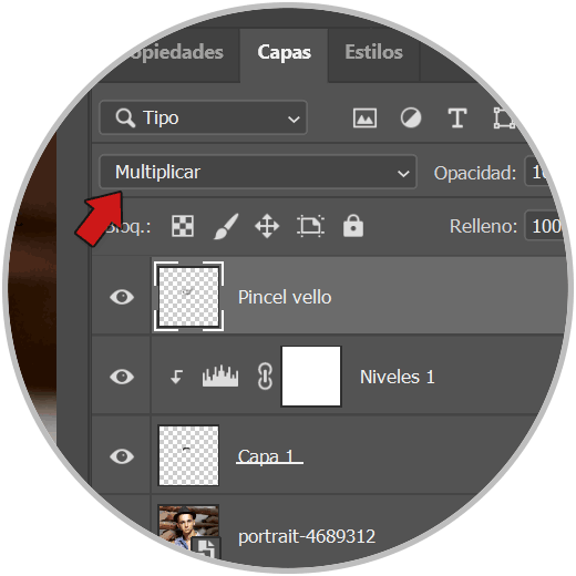 Vamos a poner también esta capa en Modo “Multiplicar” para que tenga el mismo Modo que el bigote inicial: