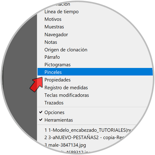 Para importarlo será sencillo, Abrimos el Panel de “Pinceles” desde “Ventana” y lo seleccionamos para mostrarlo.