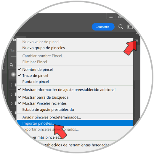 Veremos un icono de 3 rayas en la parte derecha. Aquí elegiremos “Importar pinceles” y buscamos el pincel descargado o que tengamos nosotros.