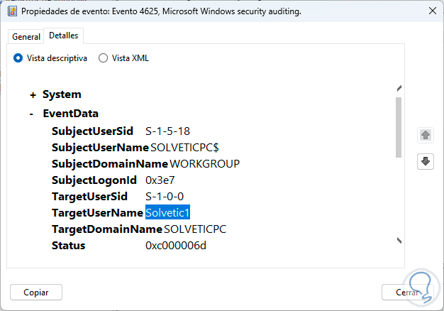 Damos doble clic sobre alguno para ver sus detalles y en la pestaña "Detalles" es posible ver el usuario que realizo este inicio de sesión:
