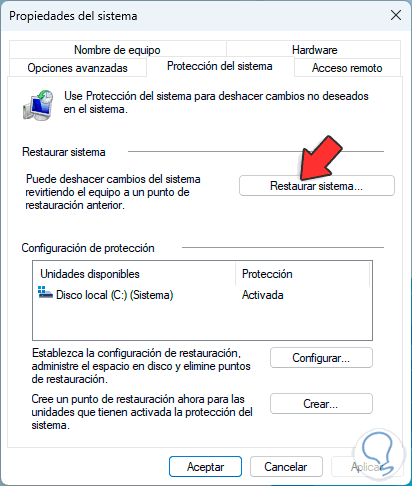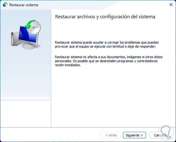 Damos clic en "Restaurar sistema" para desplegar el asistente: