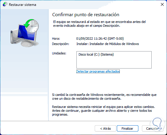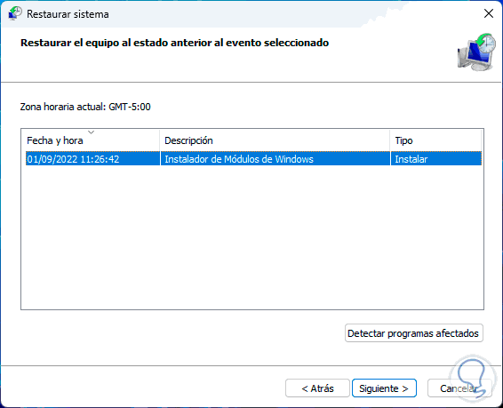 Seleccionamos el punto de restauración: