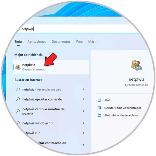 Para lograr esto en el buscador de Inicio ingresamos "netplwiz" y ejecutamos el comando: