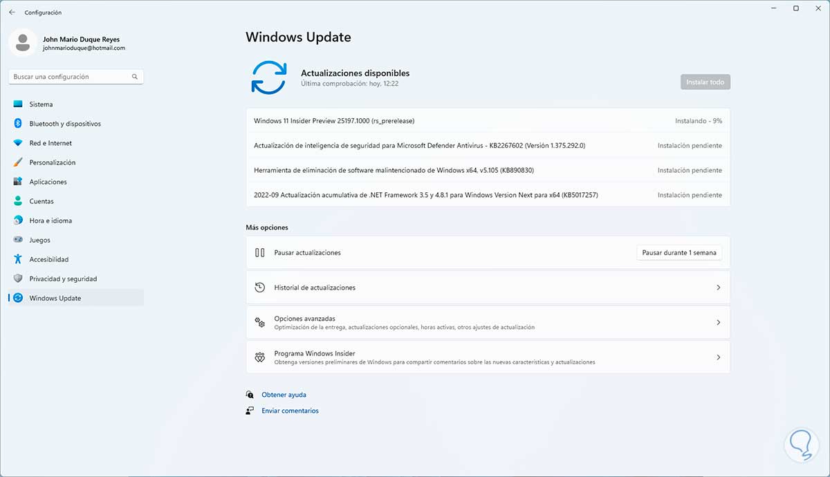 Vamos a "Inicio - Configuración - Windows Update" y validamos si es posible instalar actualizaciones: