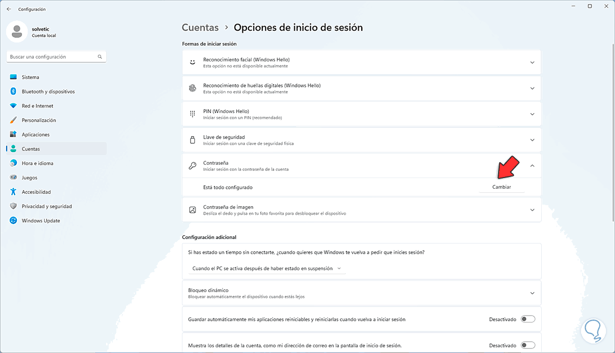 Dentro de las diferentes opciones, en este caso hacemos uso de contraseñas, damos clic en "Contraseña" y luego damos clic en "Cambiar":
