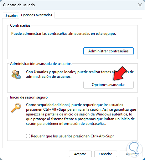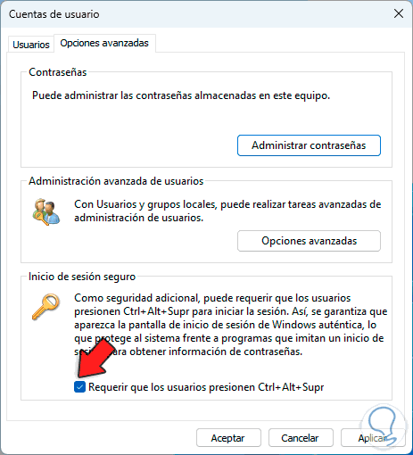 Allí activamos la casilla "Requerir que los usuarios presionen Ctrl + Alt + Supr":