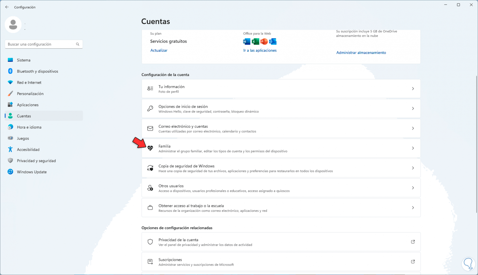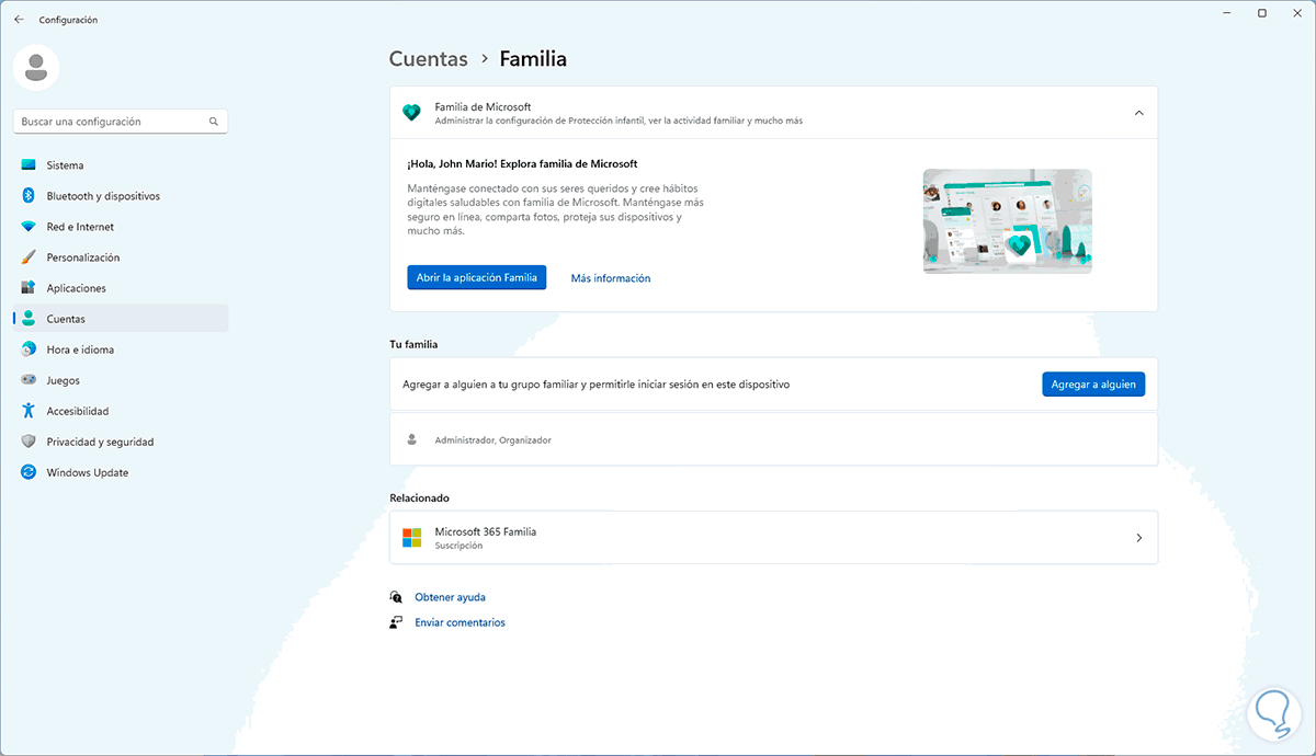 Ahora iniciamos sesión y vamos a "Inicio - Configuración - Cuentas - Familia":
