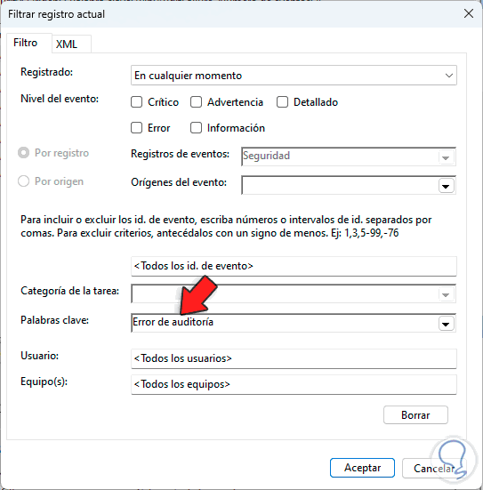 En "Palabras clave" seleccionamos "Error de auditoría":
