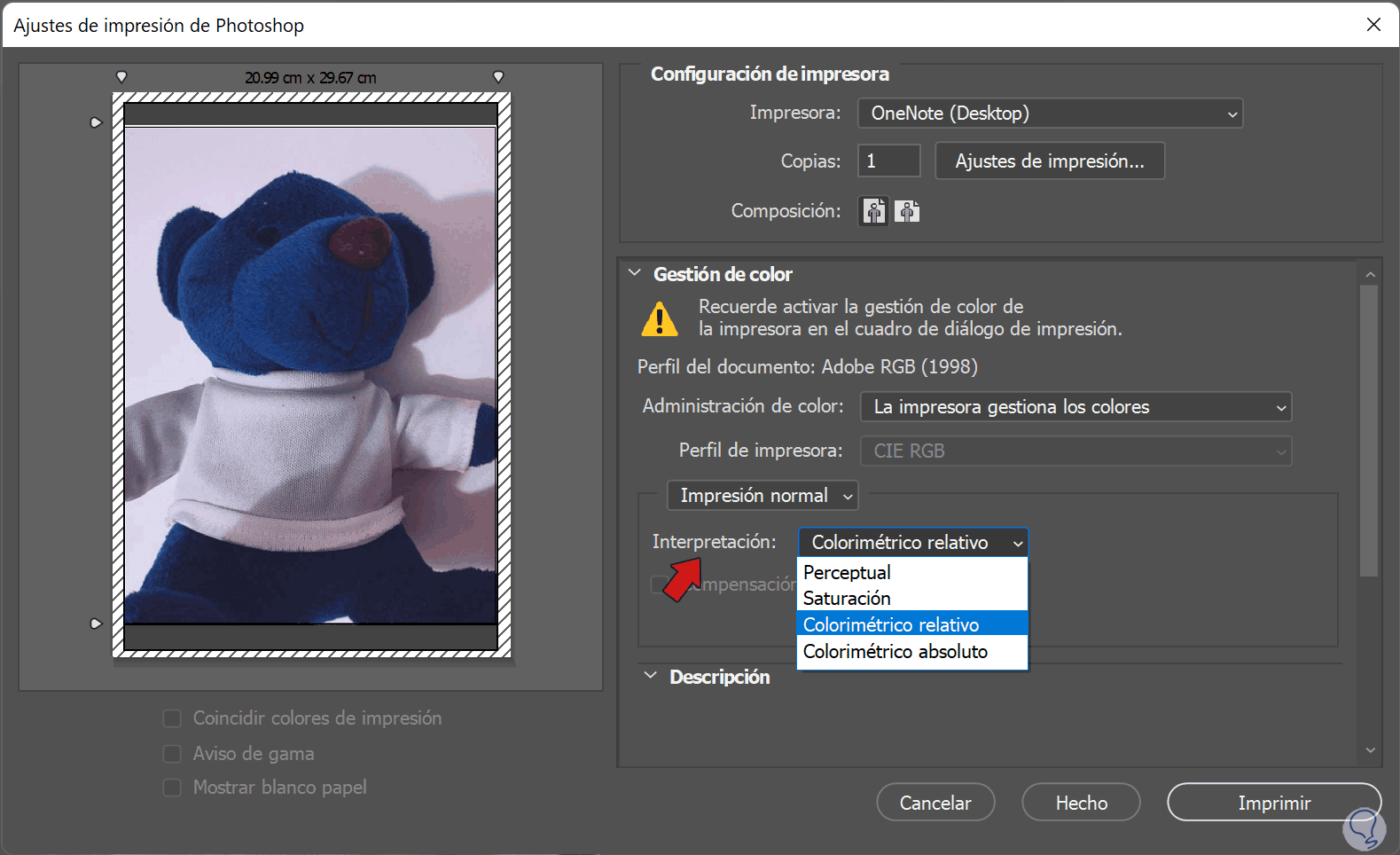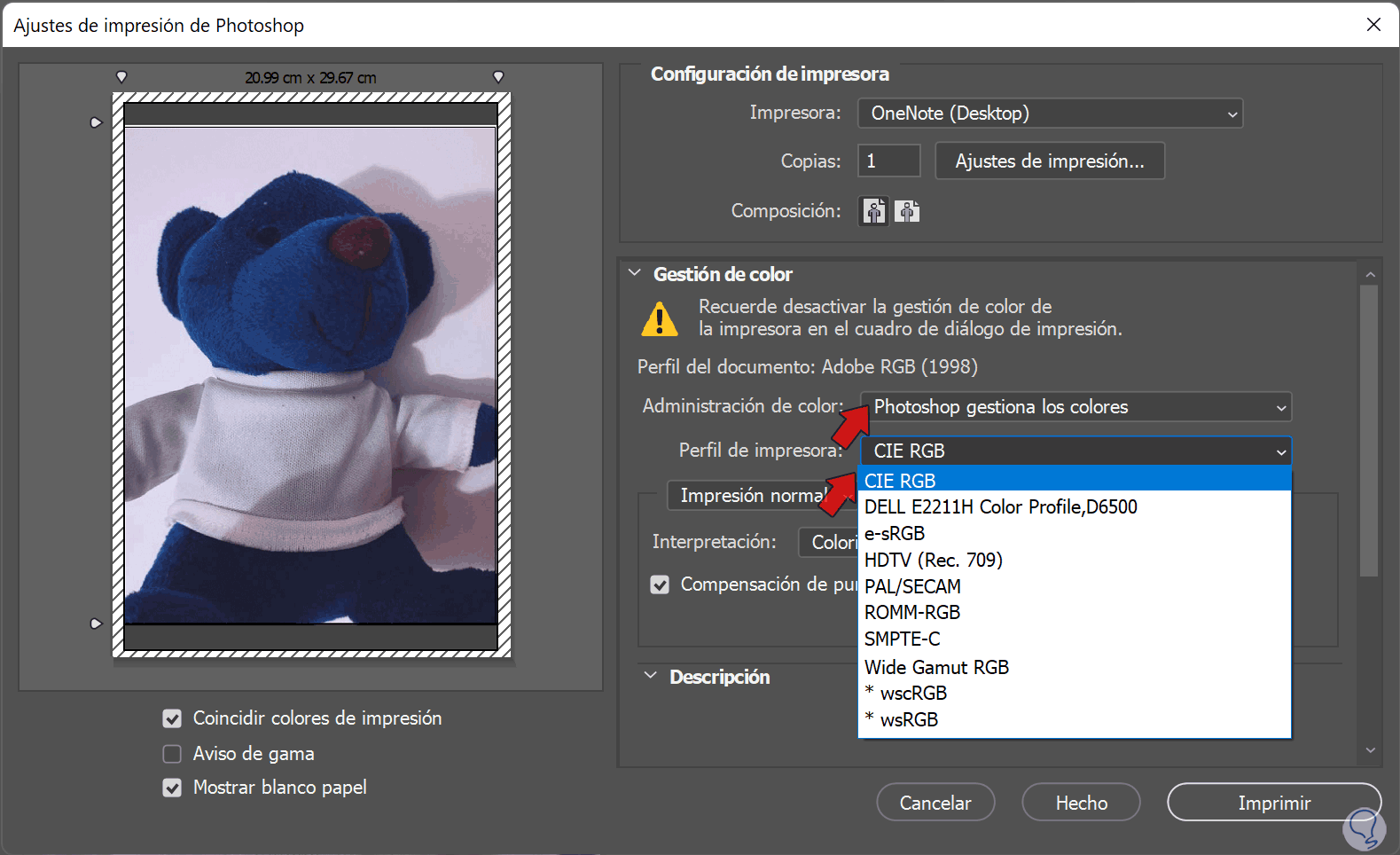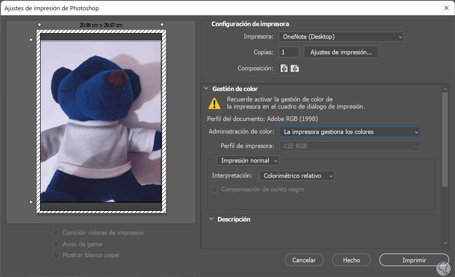 - La impresora gestiona los colores. Photoshop realizará muy poca conversión de espacio de color de nuestra imagen para que la impresora pueda hacer la impresión y la reconozca. Esta opción es recomendada cuando vamos a usar impresoras de inyección de tinta fotográficas. También recomendado para personas que no tienen mucho conocimiento sobre la gestión del color. Al dejar que la impresora elija el perfil evitaremos posibles errores.
