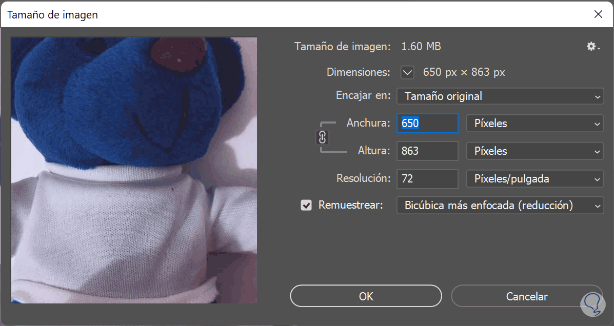 Aquí veremos el tamaño de nuestra imagen donde debemos fijarnos en las dimensiones y la Resolución.