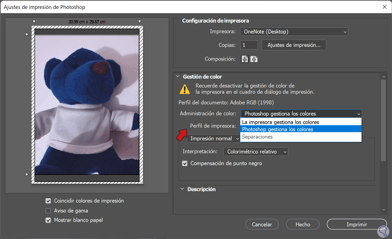 En la opción de “Administración de color” podemos elegir entre que “La impresora gestiona los colores” o que “Photoshop gestiona los colores”. Las diferencias serán: