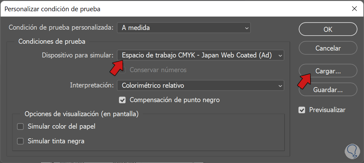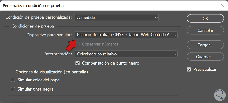 Aquí podremos elegir el “Dispositivo para simular” el espacio de trabajo que vayamos a usar a la hora de imprimir para ver nuestro resultado. En caso de tener descargado un perfil de color podremos usar la opción de “Cargar”.