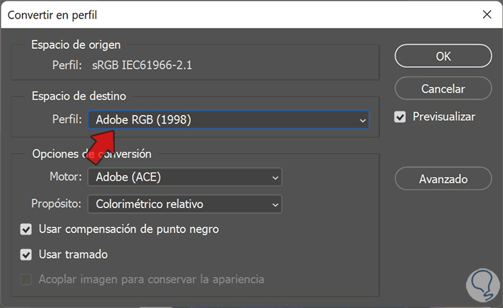 Vamos a convertir el espacio de color a Adobe RGB para trabajar con impresiones: