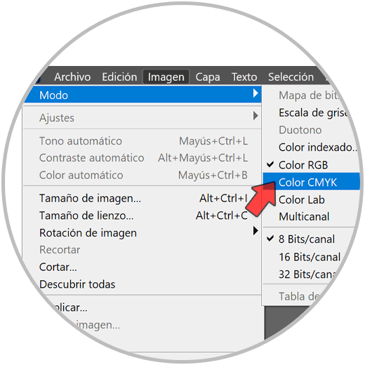 Podemos cambiar el modo de imagen de nuestras fotografías desde “Imagen – Modo – Color CMYK”.