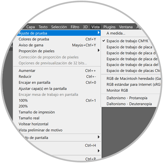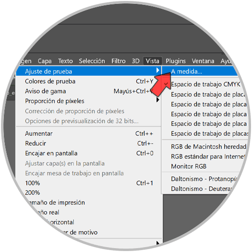 Para poder entrar en el modo de vista previa contamos con la opción dentro del menú superior y para ello iremos a “Vista – Ajuste de prueba”. Aquí elegiremos uno de los espacios que aparecen como el de CMYK o bien podemos personalizarlo con la opción “A medida”.