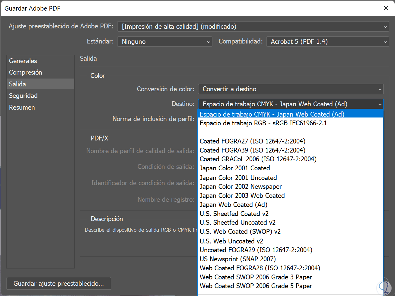 En la ventana que nos aparece podremos ir configurando nuestro PDF según las necesidades. La parte de gestión de color lo encontraremos en el apartado de “Salida”. Aquí es donde elegiremos si hacer una conversión de color con el perfil que nos hayan indicado en la imprenta.
