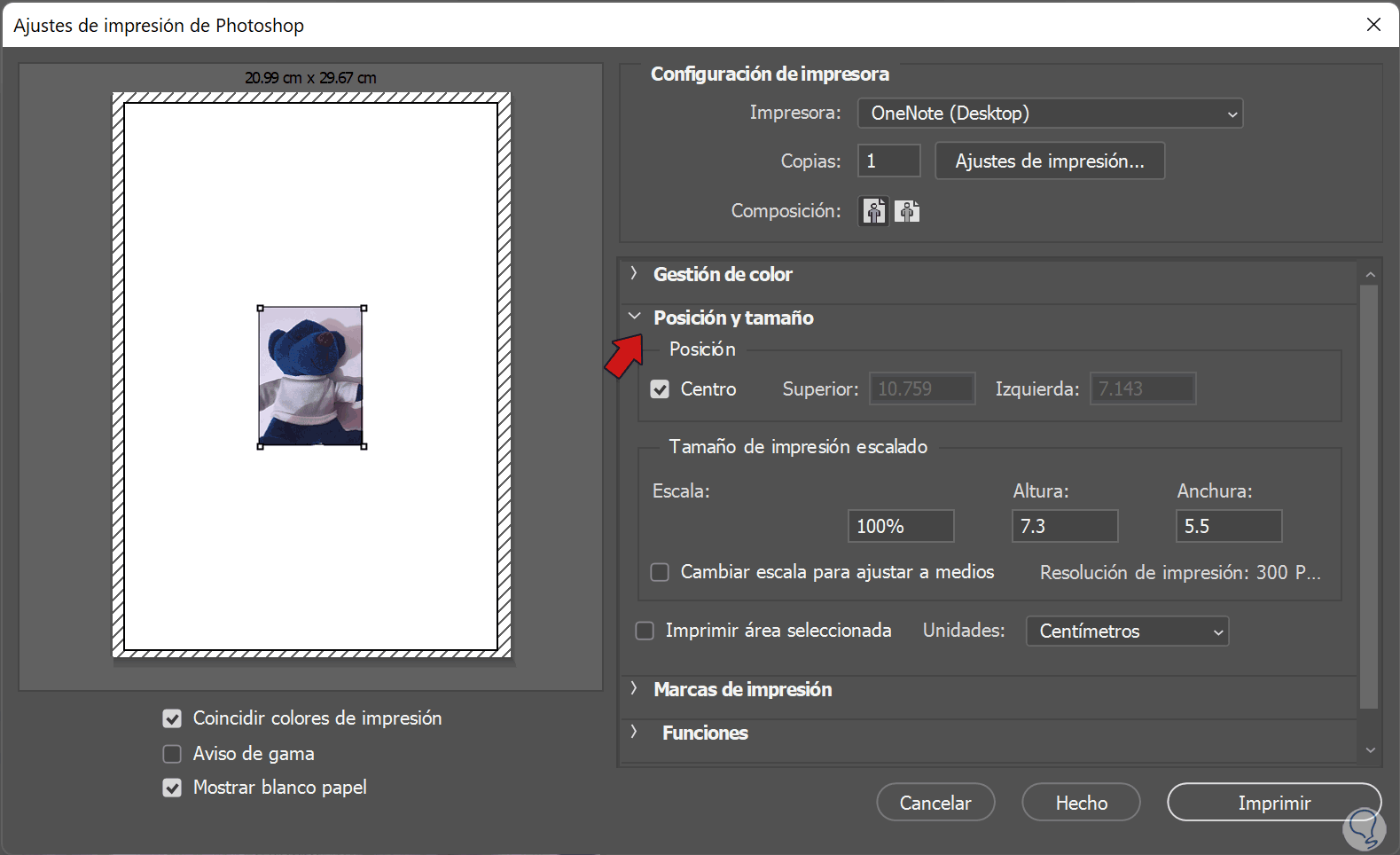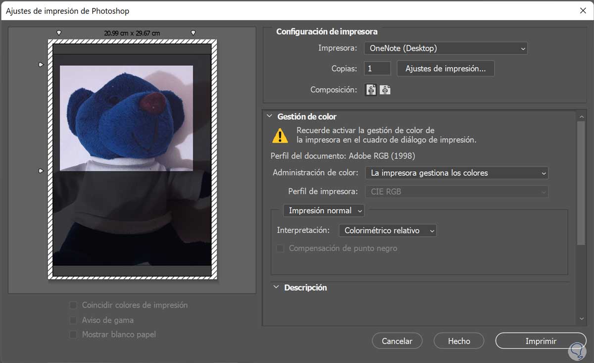 En la ventana de impresión podemos elegir las diferentes configuraciones para imprimir el documento de Photoshop.