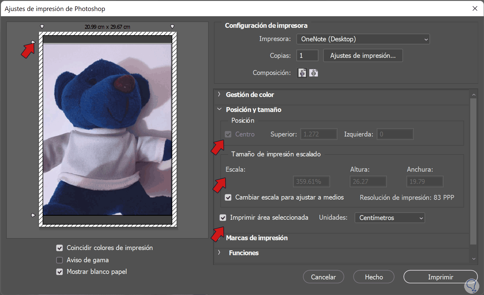 Con las diferentes opciones podrás cambiar la “Posición” de donde se ubicará la imagen dentro del papel elegido para la impresión, la escala a la que se colocará la imagen o hasta elegir “Imprimir un área seleccionada” y marcar en la imagen qué parte únicamente queremos imprimir, entre otras opciones de configuración.