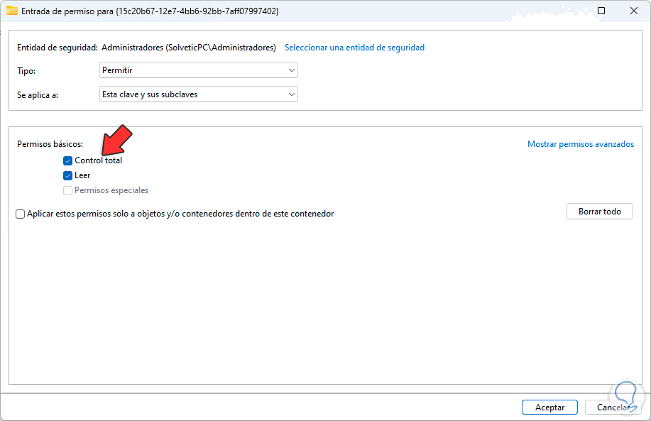 Damos clic derecho sobre el resultado seleccionado y seleccionamos la opción "Permisos":