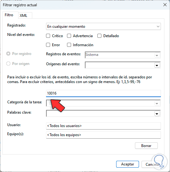 Adicional puedes dar clic en "Filtrar registro actual" y en el campo "<<Todos los ID de evento>>" ingresamos el valor 10016:
