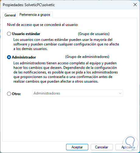 Seleccionamos el usuario actual y damos clic en "Propiedades", luego en la pestaña "Pertenencia a grupos" validamos que sea administrador: