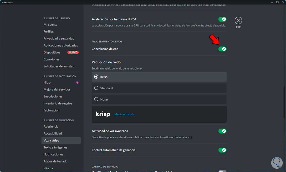 Existen algunas funciones en Discord a nivel de voz que buscan mejorar el funcionamiento de esta pero al ser avanzadas pueden dar lugar a que se presente errores en el micrófono, podemos desactivarlas.