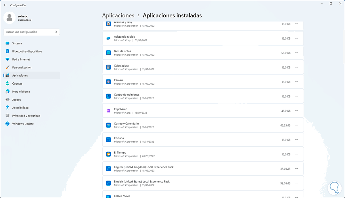 Para este proceso vamos a "Inicio - Configuración - Aplicaciones - Aplicaciones instaladas":