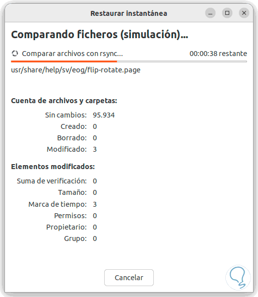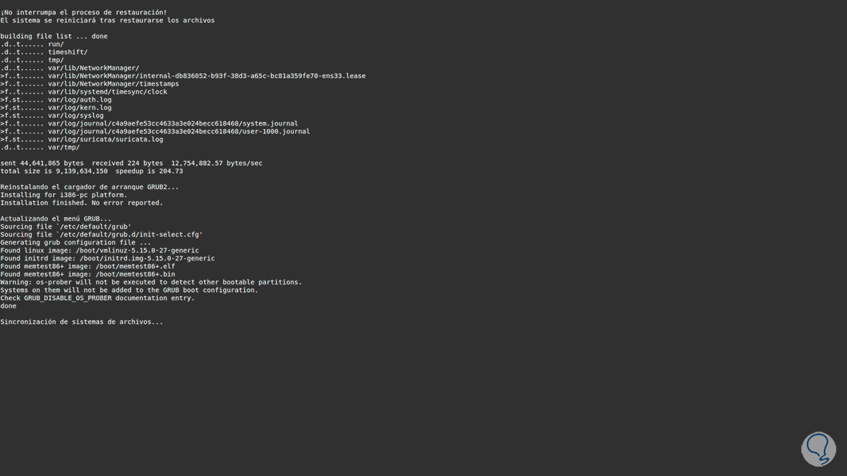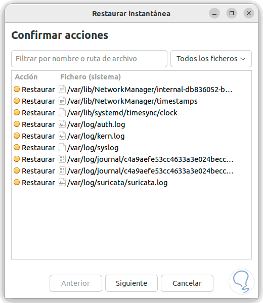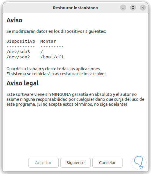 Allí podemos ver la última instantánea realizada y la mas antigua con su fecha y hora, para restaurar el sistema desde una copia damos clic en "Restaurar" y se abrirá lo siguiente: