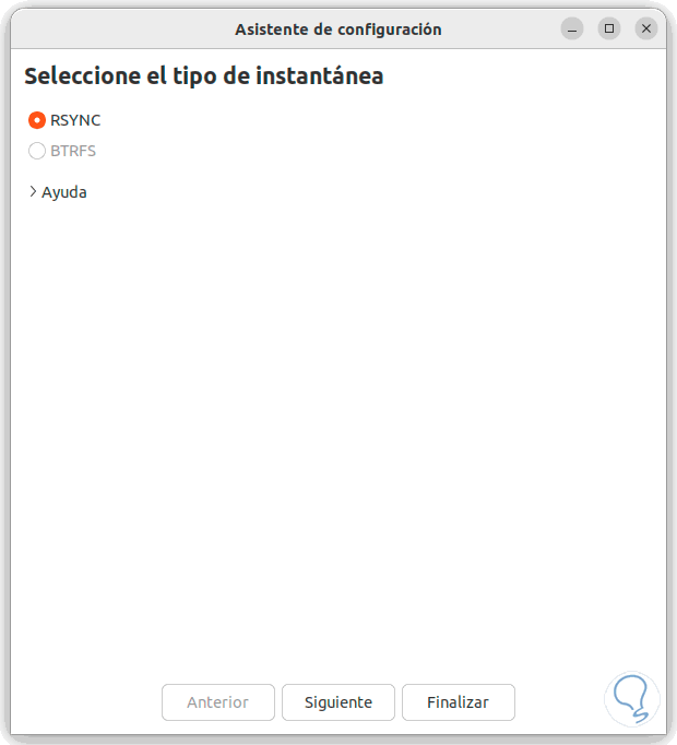 - El modo RSYNC en donde las instantáneas hacen uso de rsync y enlaces duros, en este caso los archivos serán compartidos entre instantáneas permitiendo un ahorro de espacio en el disco duro, con RSYNC la instantánea es una copia de seguridad completa del sistema la cual puede ser gestionada desde un administrador de archivos