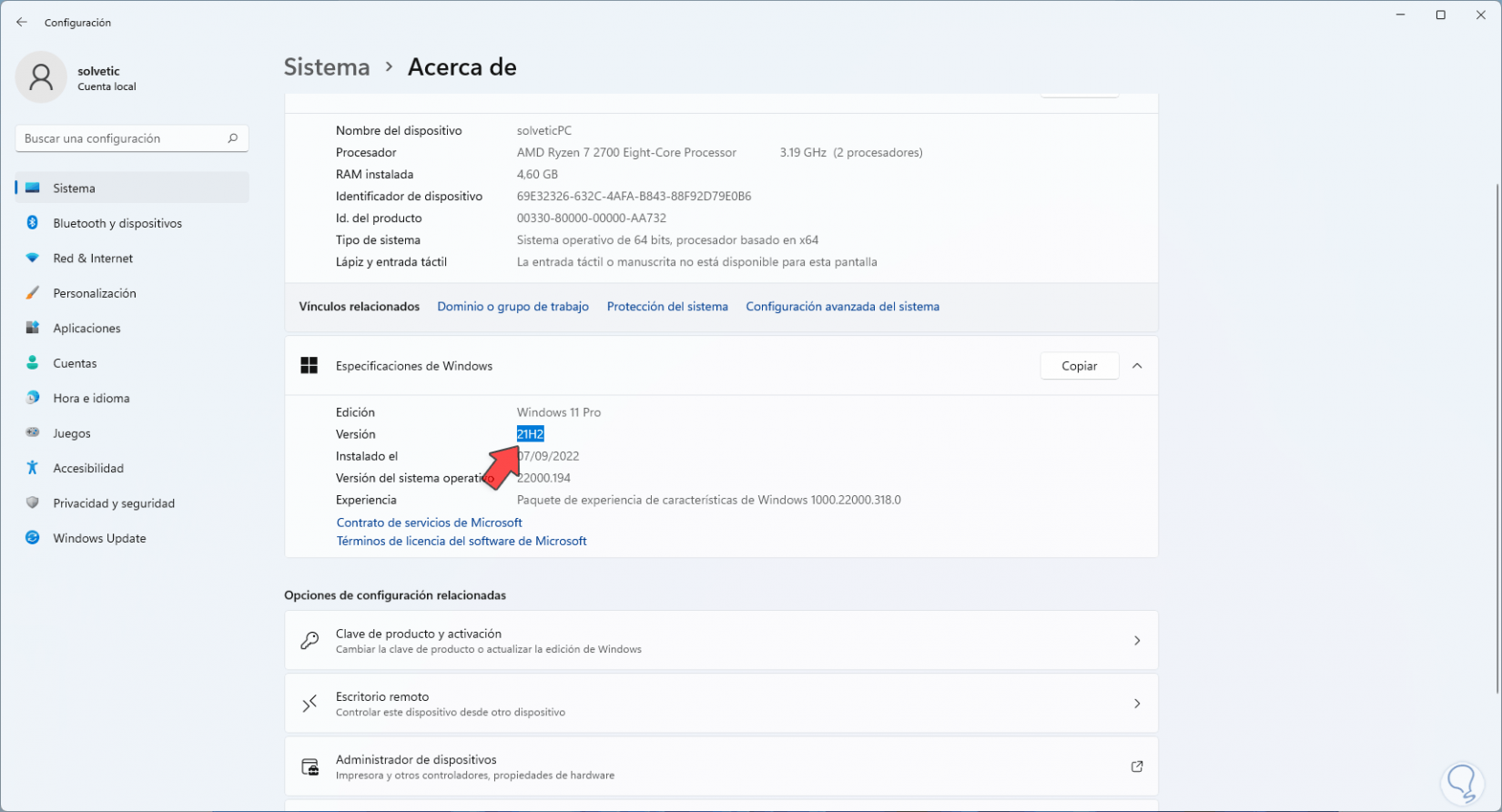 En la sección "Versión" validamos que estamos usando Windows 11 21H2: