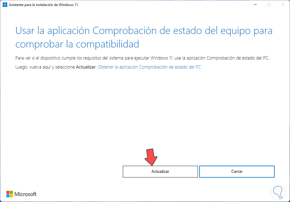 Allí se requiere validar que el equipo que estamos usando sea compatible con Windows 11, algo ilógico porque ya se pasó esta validación al actualizar de Windows 10 a 11 pero así es Microsoft, damos clic en "Obtener la aplicación comprobación del estado del PC" y esta utilidad se descargará: