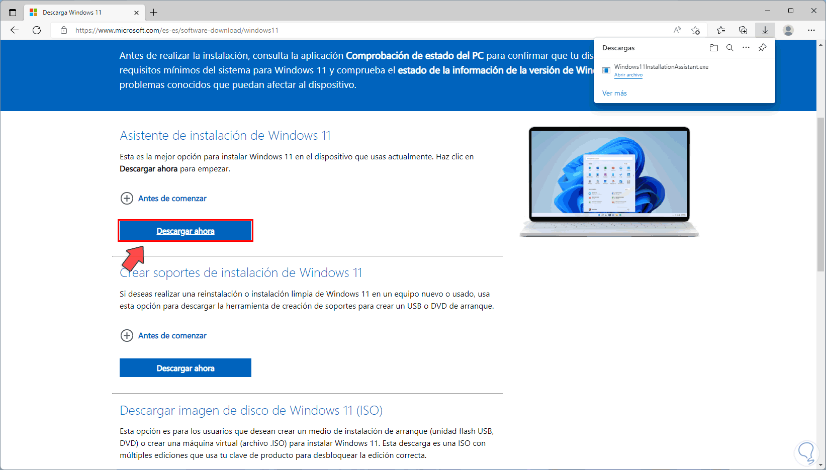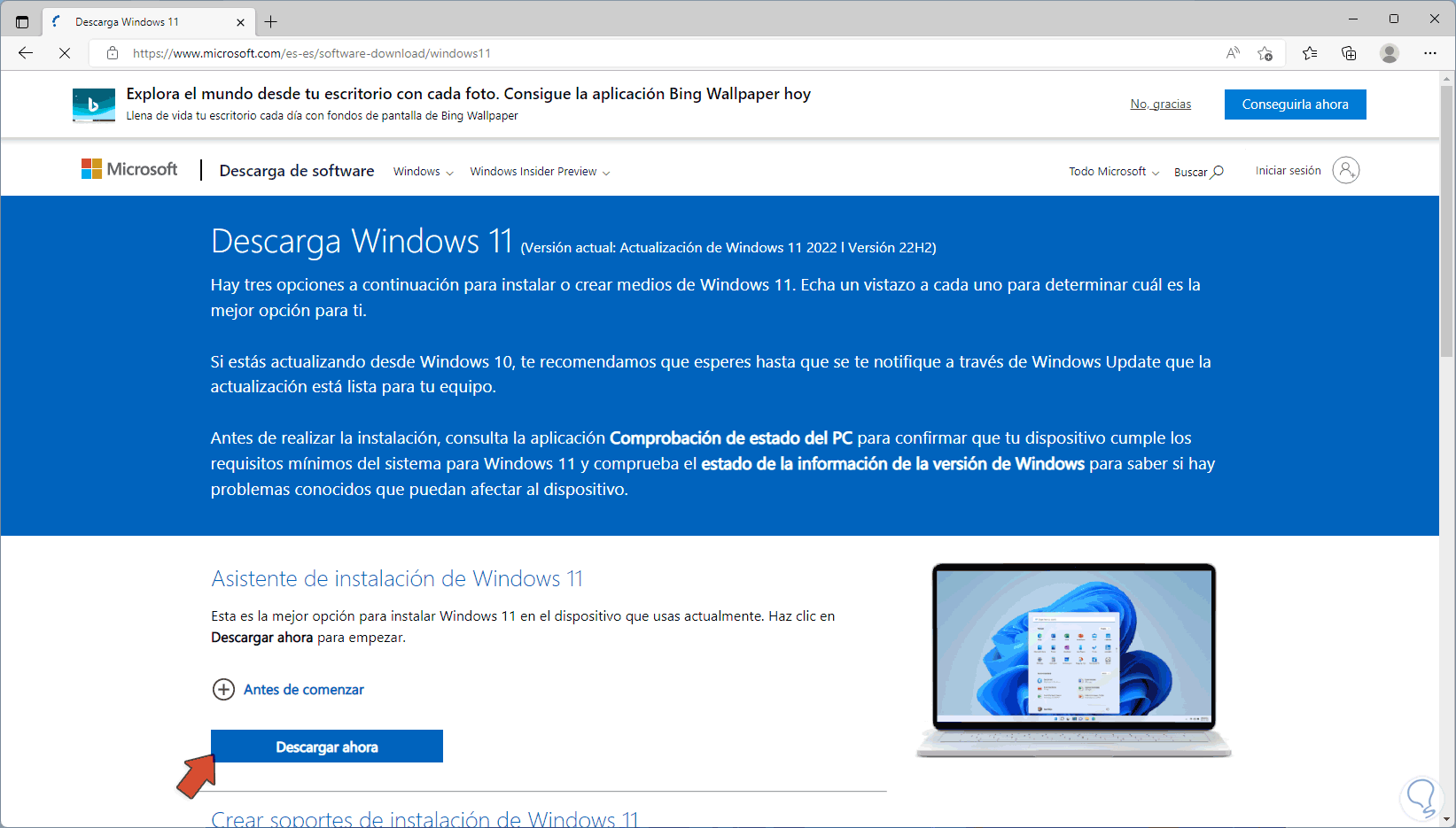 Podemos ver que allí está disponible Windows 11 22H2, descargamos la utilidad de actualización de Windows 11: